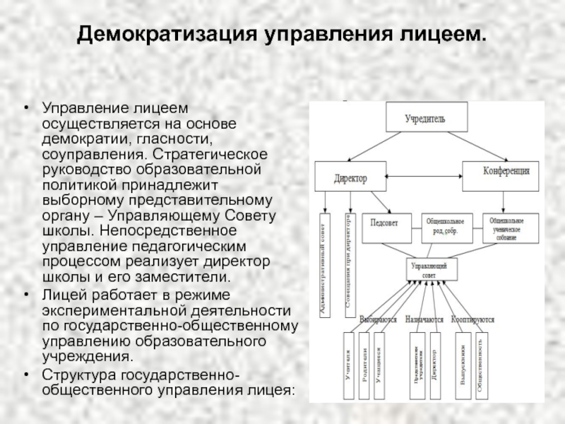Слайд 36Демократизация управления лицеем.
