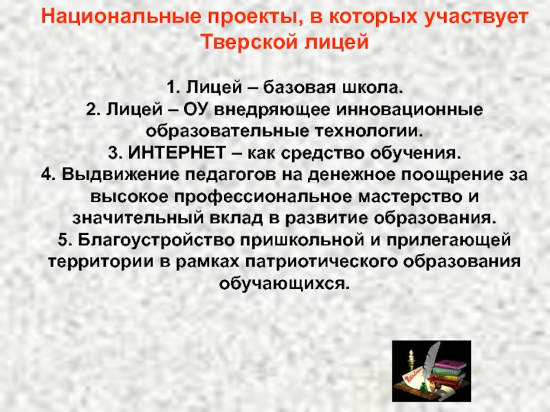 Слайд 31Национальные проекты, в которых участвует Тверской лицей