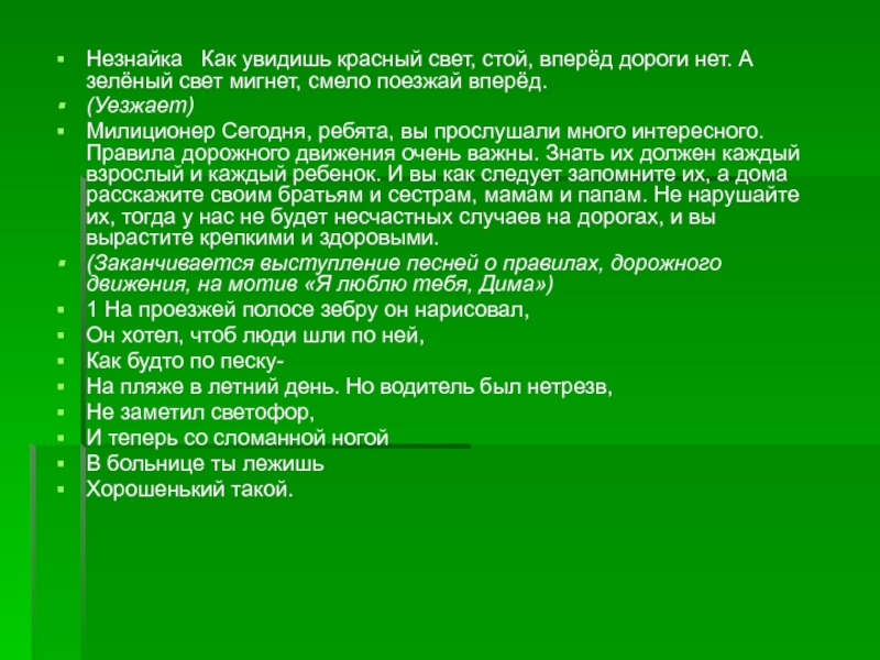 Пропуская всех детей. Пусть ему зелёный свет горит, Пусть будет путь открыт, Пусть встретит в нем друзей!