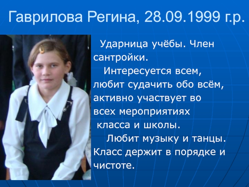 Слайд 5Гаврилова Регина, 28.09.1999 г.р.