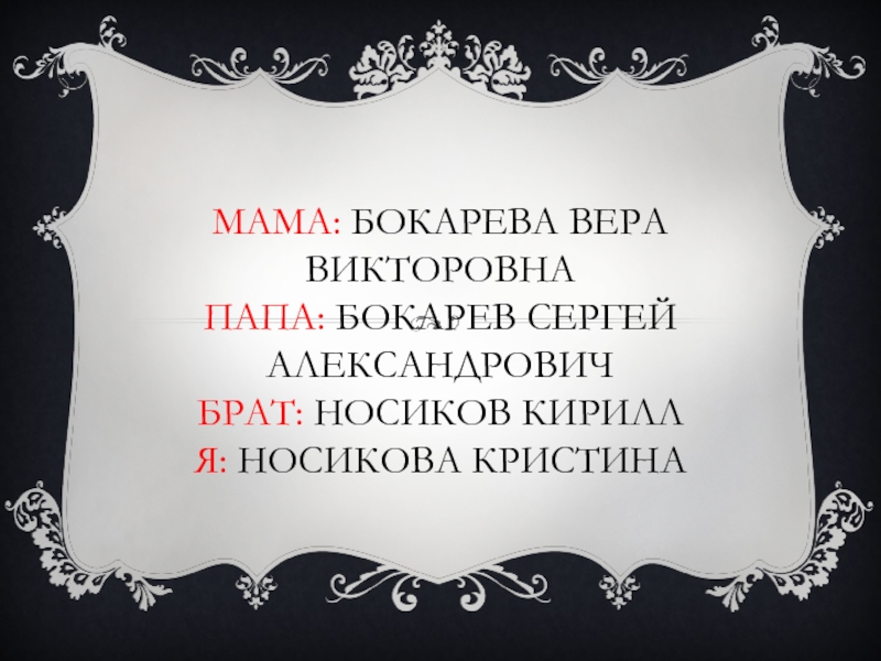 Слайд 2МАМА: БОКАРЕВА ВЕРА ВИКТОРОВНА ПАПА: БОКАРЕВ СЕРГЕЙ АЛЕКСАНДРОВИЧ БРАТ: НОСИКОВ КИРИЛЛ Я: НОСИКОВА КРИСТИНА