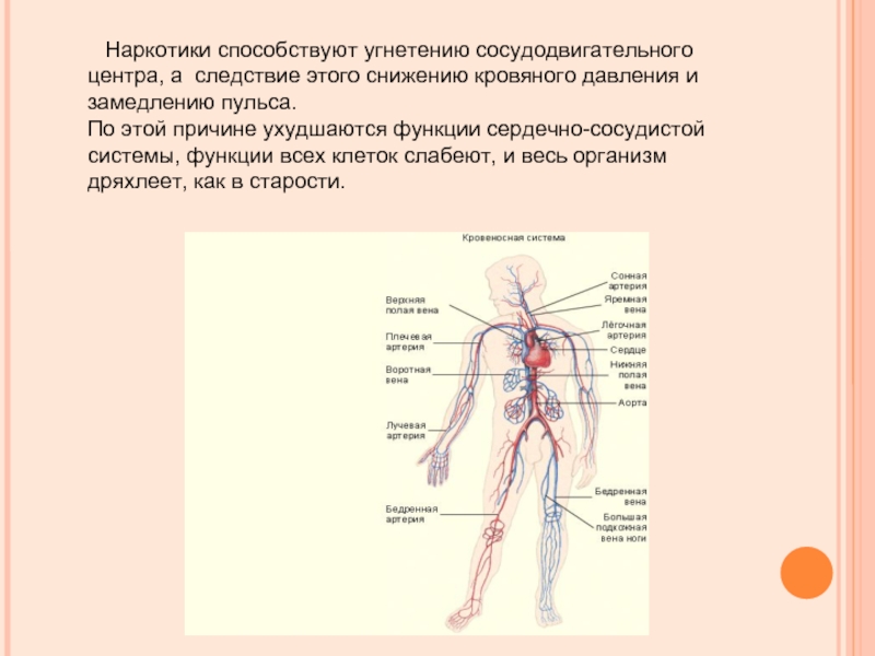 Слайд 13 Наркотики способствуют угнетению сосудодвигательного центра, а следствие этого снижению