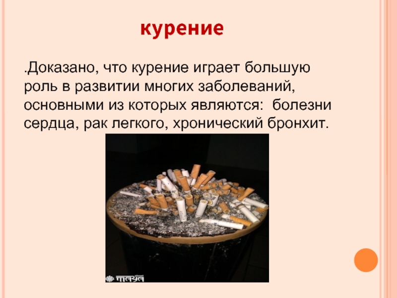 .Доказано, что курение играет большую роль в развитии многих заболеваний, основными