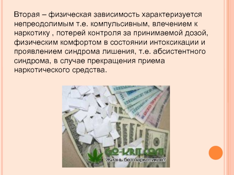Слайд 8Вторая – физическая зависимость характеризуется непреодолимым т.е. компульсивным, влечением к наркотику