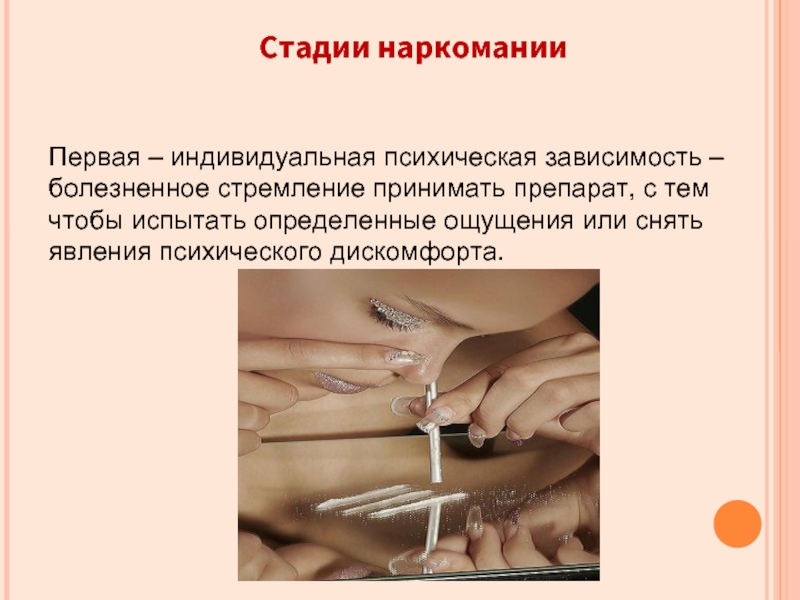 Слайд 7Первая – индивидуальная психическая зависимость – болезненное стремление принимать препарат, с