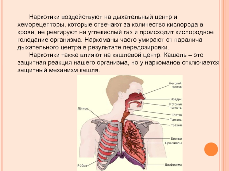 Слайд 12 Наркотики воздействуют на дыхательный центр и хеморецепторы, которые отвечают за количество