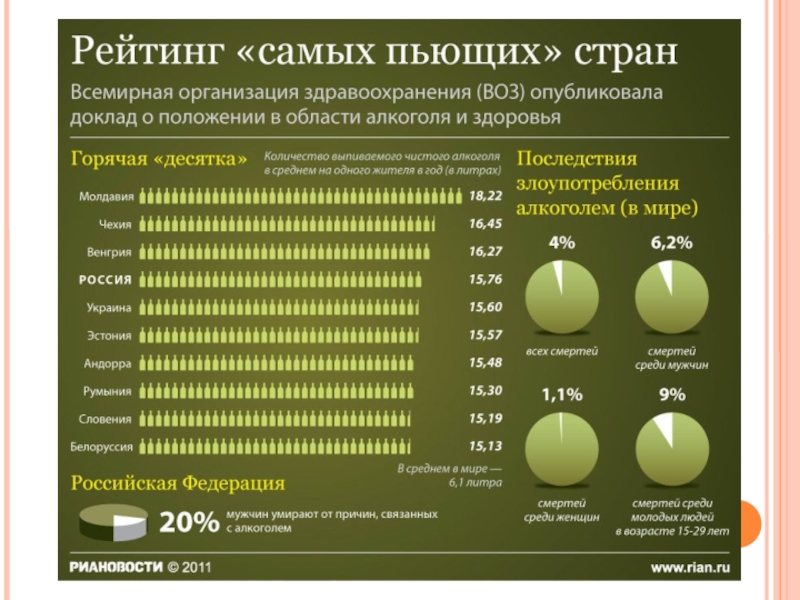Слайд 18Алкоголи́зм — заболевание, разновидность токсикомании, характеризующееся болезненным пристрастием к алкоголю (психическая