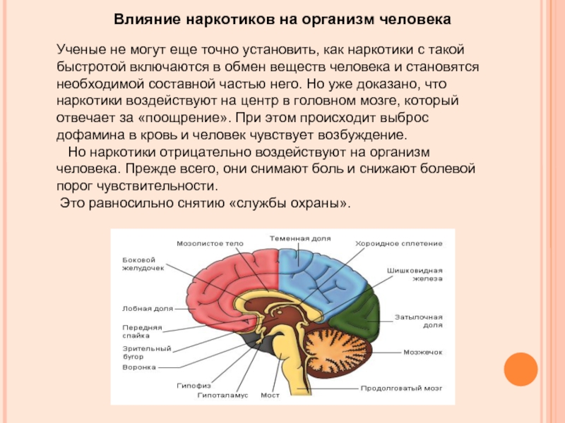 включаются в обмен веществ человека и становятся необходимой составной частью него. Но уже доказано, что наркотики воздействуют на центр в головном мозге, который отвечает за «поощрение». При этом происходит выброс дофамина в кровь и человек чувствует возбуждение.