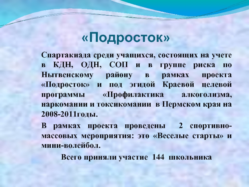 в группе риска по Нытвенскому району в рамках проекта «Подросток» и под эгидой Краевой целевой программы «Профилактика алкоголизма, наркомании и токсикомании в Пермском края на 2008-2011годы.