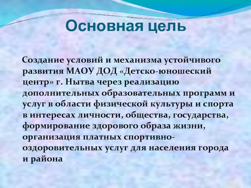 ДОД «Детско-юношеский центр» г. Нытва через реализацию дополнительных образовательных программ и услуг в области физической культуры и спорта в интересах личности, общества, государства, формирование здорового образа жизни, организация платных спортивно-оздоровительных услуг для населения города и района