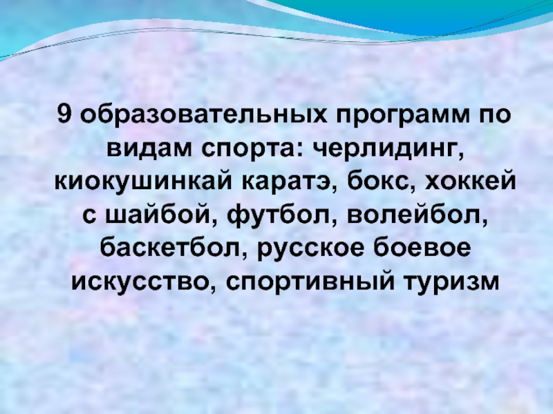 Слайд 12 9 образовательных программ по видам спорта: черлидинг, киокушинкай каратэ,