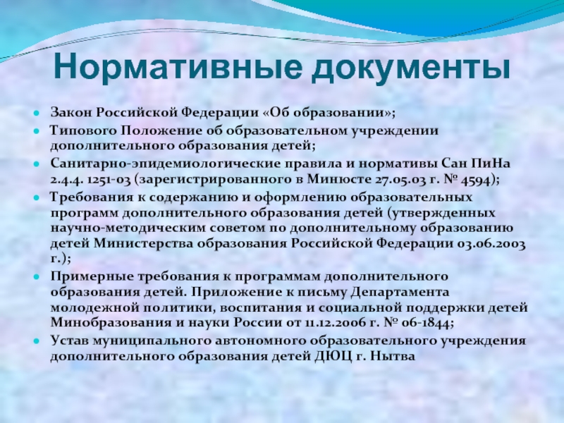 Санитарно-эпидемиологические правила и нормативы Сан ПиНа 2.4.4. 1251-03 (зарегистрированного в Минюсте 27.05.03 г. № 4594);