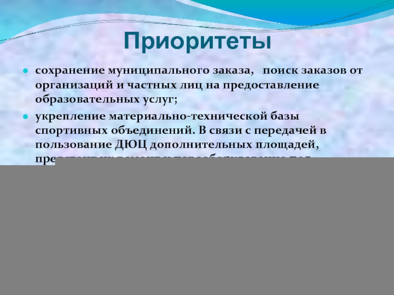 укрепление материально-технической базы спортивных объединений. В связи с передачей в пользование ДЮЦ дополнительных площадей, предстоит их ремонт и переоборудование под туристскую базу, спроектировать ее деятельность;