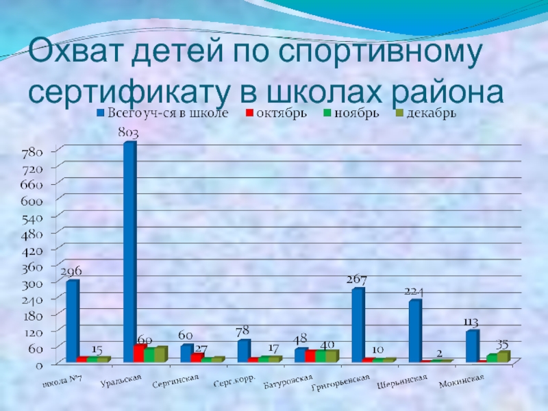 Слайд 35Охват детей по спортивному сертификату в школах района