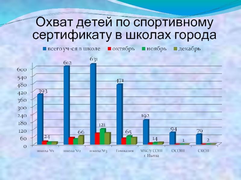 Слайд 34Охват детей по спортивному сертификату в школах города