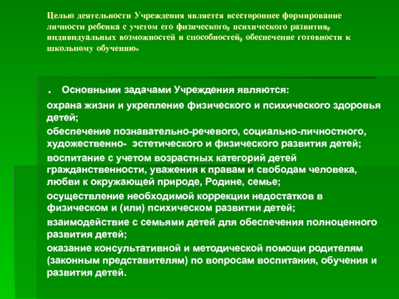 оказание консультативной и методической помощи родителям (законным представителям) по вопросам воспитания, обучения и развития детей.