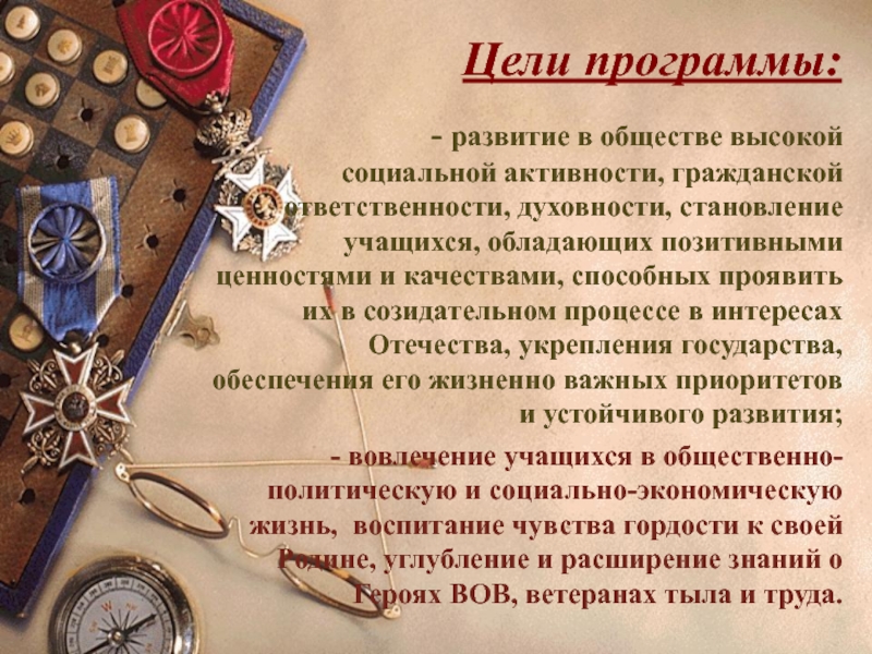 - вовлечение учащихся в общественно-политическую и социально-экономическую жизнь, воспитание чувства гордости к своей Родине, углубление и расширение знаний о Героях ВОВ, ветеранах тыла и труда.