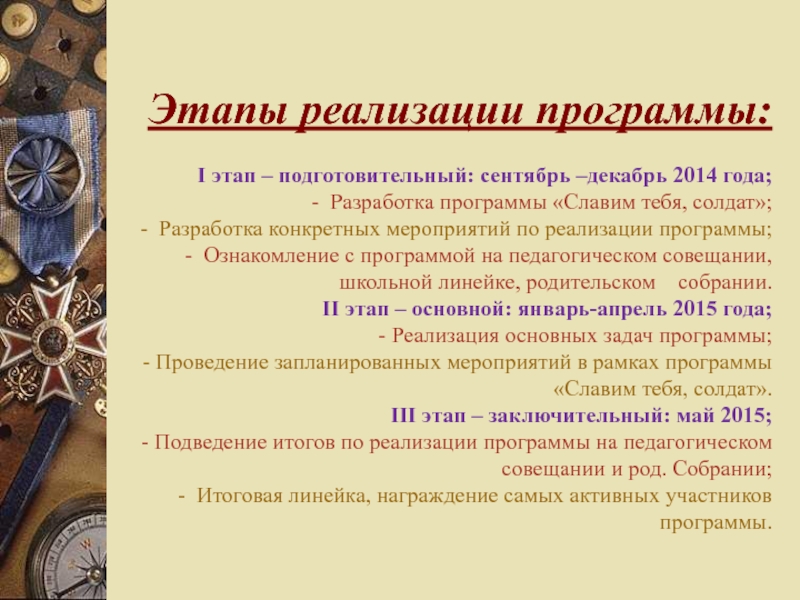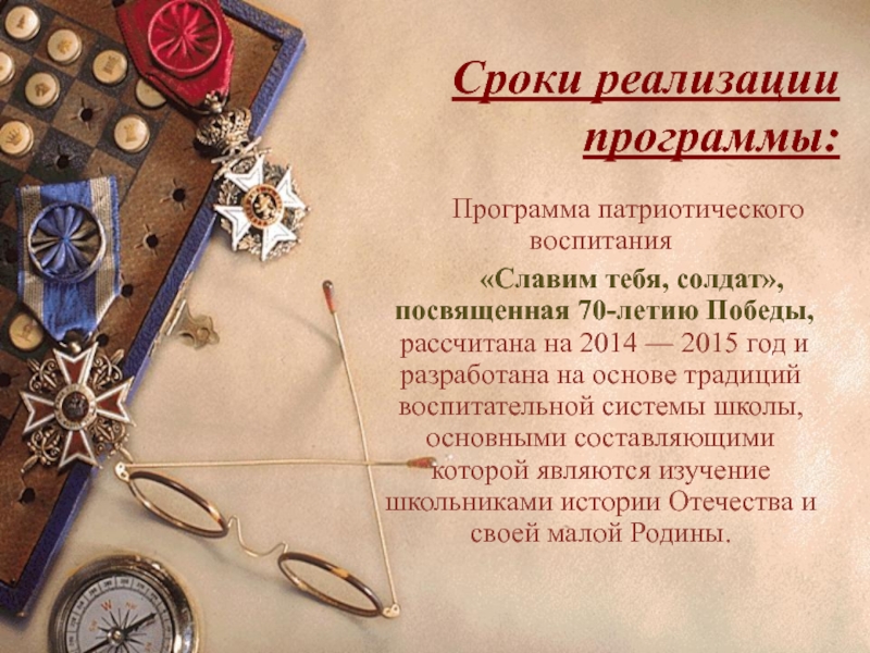 рассчитана на 2014 — 2015 год и разработана на основе традиций воспитательной системы школы, основными составляющими которой являются изучение школьниками истории Отечества и своей малой Родины.
