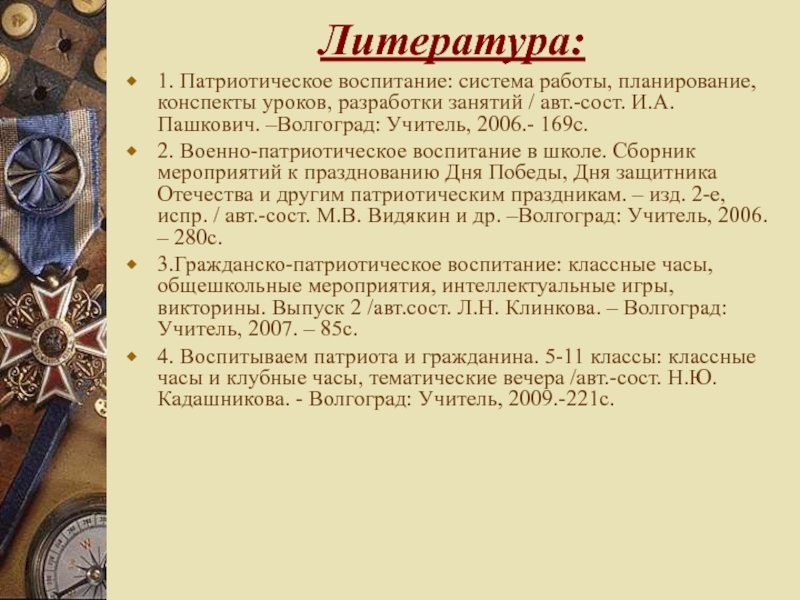 3.Гражданско-патриотическое воспитание: классные часы, общешкольные мероприятия, интеллектуальные игры, викторины. Выпуск 2 /авт.сост. Л.Н. Клинкова. – Волгоград: Учитель, 2007. – 85с.