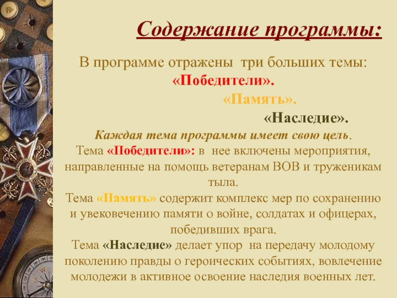 Тема «Память» содержит комплекс мер по сохранению и увековечению памяти о войне, солдатах и офицерах, победивших врага.