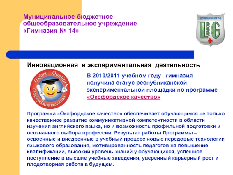 качество» обеспечивает обучающимся не только качественное развитие коммуникативной компетентности в области изучения английского языка, но и возможность профильной подготовки и осознанного выбора профессии. Результат работы Программы – освоенные и внедренные в учебный процесс новые передовые технологии языкового образования, мотивированность педагогов на повышение квалификации, высокий уровень знаний у обучающихся, успешное поступление в высшие учебные заведения, уверенный карьерный рост и плодотворная работа в будущем.