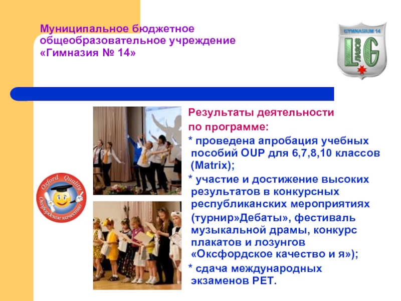 (турнир»Дебаты», фестиваль музыкальной драмы, конкурс плакатов и лозунгов «Оксфордское качество и я»);