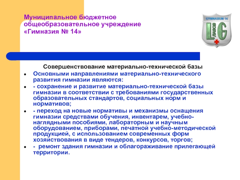 - переход на новые нормативы и механизмы оснащения гимназии средствами обучения, инвентарем, учебно-наглядными пособиями, лабораторным и научным оборудованием, приборами, печатной учебно-методической продукцией, с использованием современных форм хозяйствования в виде тендеров, конкурсов, торгов;