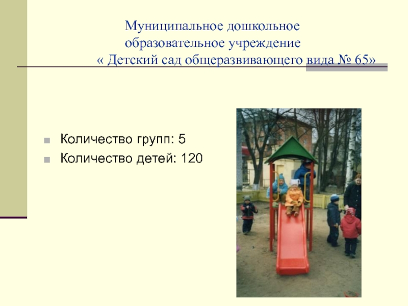 Детский сад № 65, является муниципальным  образовательным  учреждением, относится  к  типу - «дошкольное  образовательное  учреждение»; вид «детский сад общеразвивающего вида с приоритетным осуществлением интеллектуального развития воспитанников».