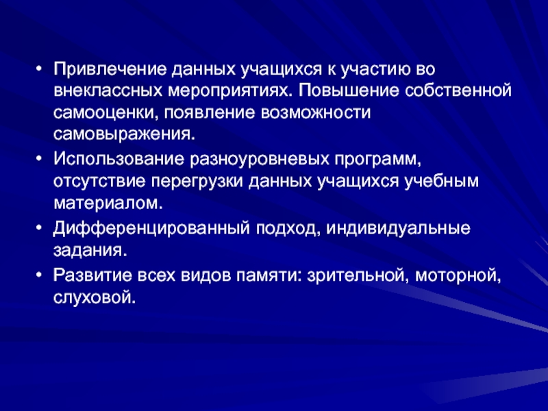 Слайд 4Привлечение данных учащихся к участию во внеклассных мероприятиях. Повышение собственной самооценки,