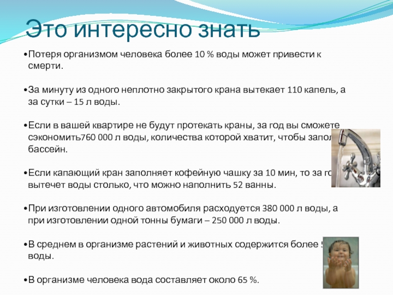 жизни всех живых организмов на Земле, одно из главных богатств на Земле. Издавна человек селился рядом с водоёмом. Там, где есть вода – есть жизнь. Трудно представить, что стало бы с нашей планетой, если бы исчезла пресная вода. Человеку нужно выпивать в день около 2-х литров воды. И примерно в 20 раз больше ежедневно требуется каждому из нас для мытья, приготовления пищи и так