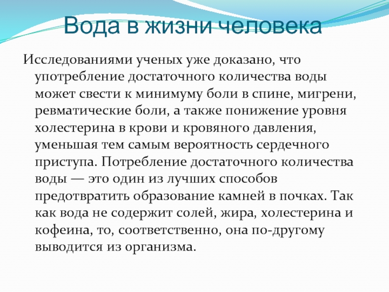 что употребление достаточного количества воды может свести к минимуму боли в спине, мигрени, ревматические боли, а также понижение уровня холестерина в крови и кровяного давления, уменьшая тем самым вероятность сердечного приступа. Потребление достаточного количества воды — это один из лучших способов предотвратить образование камней в почках. Так как вода не содержит солей, жира, холестерина и кофеина, то, соответственно, она по-другому выводится из организма.