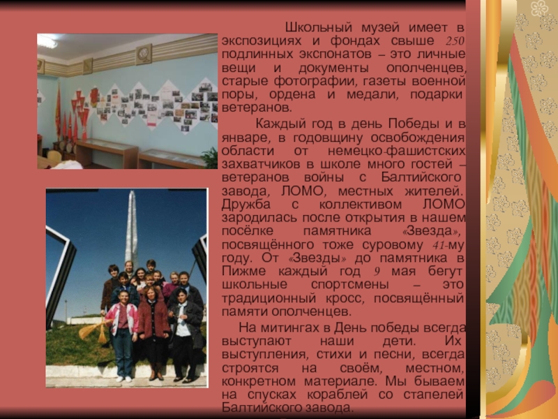 В нашей Пригородной средней общеобразовательной школе краеведение уже много лет является одним из основных направлений всей воспитательной работы. Школьный музей боевой славы посвящён тяжёлому, мало освещённому периоду Великой Отечественной войны – 41-му году, народному ополчению, а точнее – 3-му стрелковому полку 2-й дивизии ЛОМО, который состоял из рабочих и служащих ленинградского Балтийского судостроительного завода. Крепкая тридцатилетняя дружба связывает школу и завод. Мы шествуем над братским захоронением ополченцев-балтийцев в деревне Пижма и пос. Новый Свет.