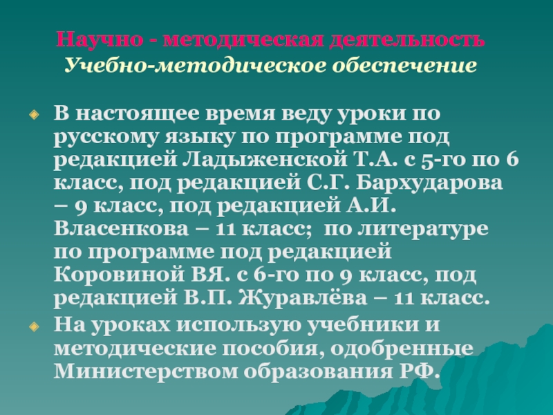 языку по программе под редакцией Ладыженской Т.А. с 5-го по 6 класс, под редакцией С.Г. Бархударова – 9 класс, под редакцией А.И. Власенкова – 11 класс; по литературе по программе под редакцией Коровиной ВЯ. с 6-го по 9 класс, под редакцией В.П. Журавлёва – 11 класс.