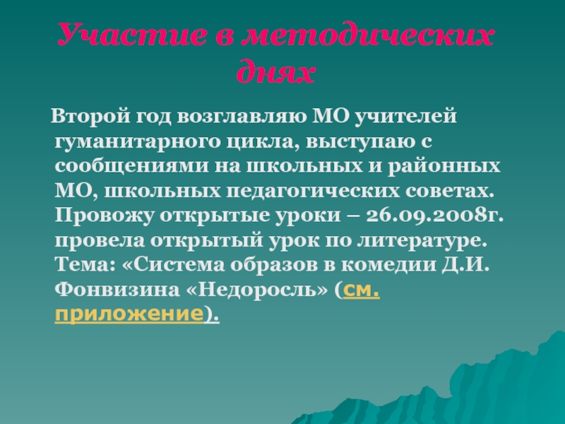 цикла, выступаю с сообщениями на школьных и районных МО, школьных педагогических советах. Провожу открытые уроки – 26.09.2008г. провела открытый урок по литературе. Тема: «Система образов в комедии Д.И. Фонвизина «Недоросль» (см. приложение).