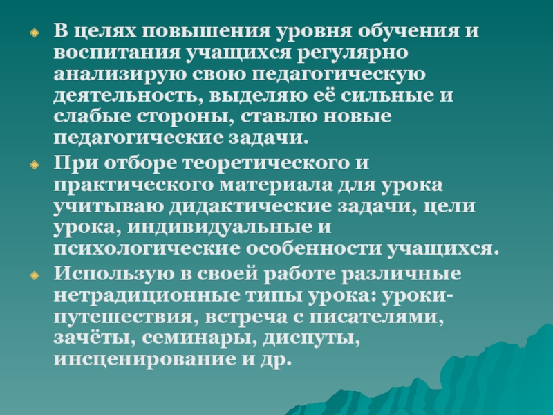 Слайд 17В целях повышения уровня обучения и воспитания учащихся регулярно анализирую свою