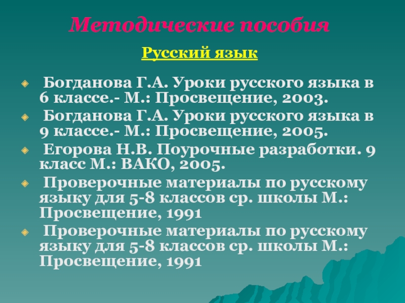 Богданова Г.А. Уроки русского языка в 9 классе.- М.: Просвещение, 2005.