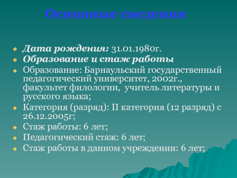 университет, 2002г., факультет филологии, учитель литературы и русского языка;
