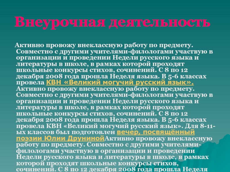 другими учителями-филологами участвую в организации и проведении Недели русского языка и литературы в школе, в рамках которой проходят школьные конкурсы стихов, сочинений. С 8 по 12 декабря 2008 года прошла Неделя языка. В 5-6 классах провела КВН «Великий могучий русский язык». Активно провожу внеклассную работу по предмету. Совместно с другими учителями-филологами участвую в организации и проведении Недели русского языка и литературы в школе, в рамках которой проходят школьные конкурсы стихов, сочинений. С 8 по 12 декабря 2008 года прошла Неделя языка. В 5-6 классах провела КВН «Великий могучий русский язык». Для 8-11-ых классов был подготовлен вечер, посвящённый поэзии Юлии ДрунинойАктивно провожу внеклассную работу по предмету. Совместно с другими учителями-филологами участвую в организации и проведении Недели русского языка и литературы в школе, в рамках которой проходят школьные конкурсы стихов, сочинений. С 8 по 12 декабря 2008 года прошла Неделя языка. В 5-6 классах провела КВН «Великий могучий русский язык». Для 8-11-ых классов был подготовлен вечер, посвящённый поэзии Юлии Друниной с использованием ИКТ. В течение всей недели проходила викторина «В мире книг»Активно провожу внеклассную работу по предмету. Совместно с другими учителями-филологами участвую в организации и проведении Недели русского языка и литературы в школе, в рамках которой проходят школьные конкурсы стихов, сочинений. С 8 по 12 декабря 2008 года прошла Неделя языка. В 5-6 классах провела КВН «Великий могучий русский язык». Для 8-11-ых классов был подготовлен вечер, посвящённый поэзии Юлии Друниной с использованием ИКТ. В течение всей недели проходила викторина «В мире книг», участники были награждены ценными призами. Возглавляю кружок «Пресс-центр», результатом которого является каждый месяц новый номер школьной газеты «Школьная жизнь» (см. школьный сайт). Пишу заметки в районную газету «Победное знамя» . Выставляю информацию и школьные новости на школьном сайте.