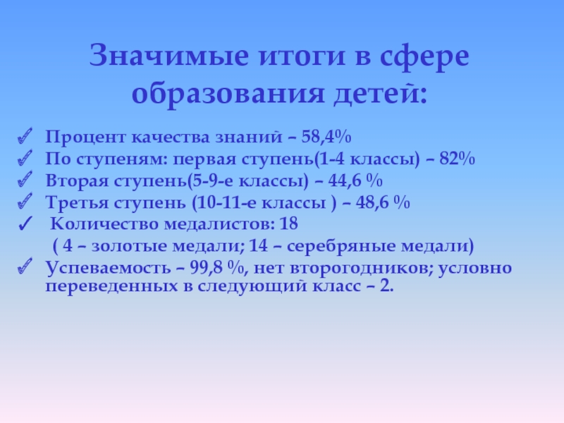 Слайд 4Значимые итоги в сфере образования детей: