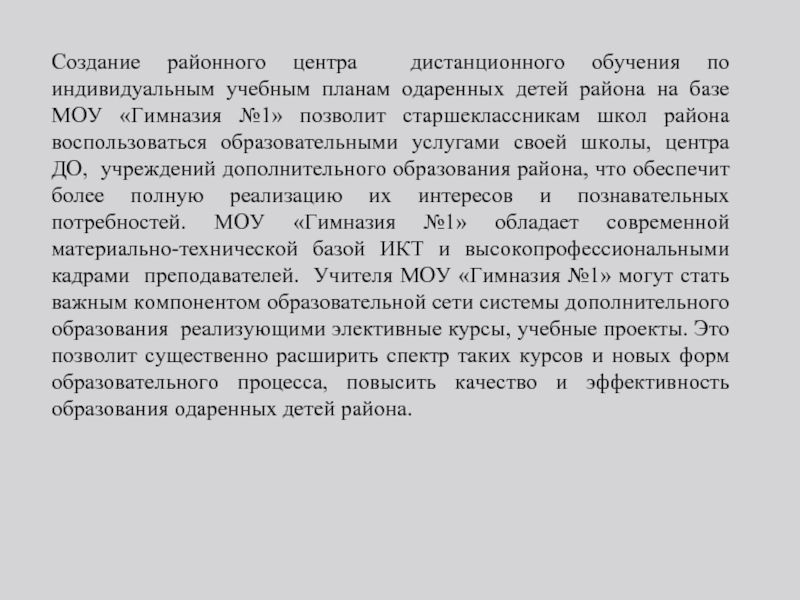 района на базе МОУ «Гимназия №1» позволит старшеклассникам школ района воспользоваться образовательными услугами своей школы, центра ДО, учреждений дополнительного образования района, что обеспечит более полную реализацию их интересов и познавательных потребностей. МОУ «Гимназия №1» обладает современной материально-технической базой ИКТ и высокопрофессиональными кадрами преподавателей. Учителя МОУ «Гимназия №1» могут стать важным компонентом образовательной сети системы дополнительного образования реализующими элективные курсы, учебные проекты. Это позволит существенно расширить спектр таких курсов и новых форм образовательного процесса, повысить качество и эффективность образования одаренных детей района.