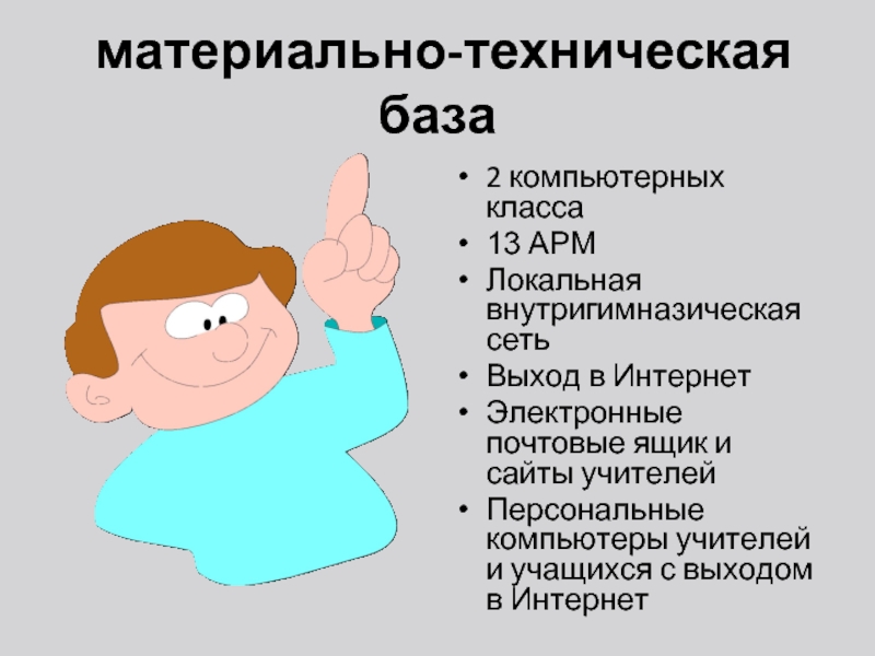 5) Имеются два компьютерных кабинета с интерактивными досками, выход в Интернет, открыты сайты гимназии и учителей, в библиотеке представлены более 15 тысяч экземпляров учебной, научной и художественной литературы, созданы условия для работы в читальном зале.