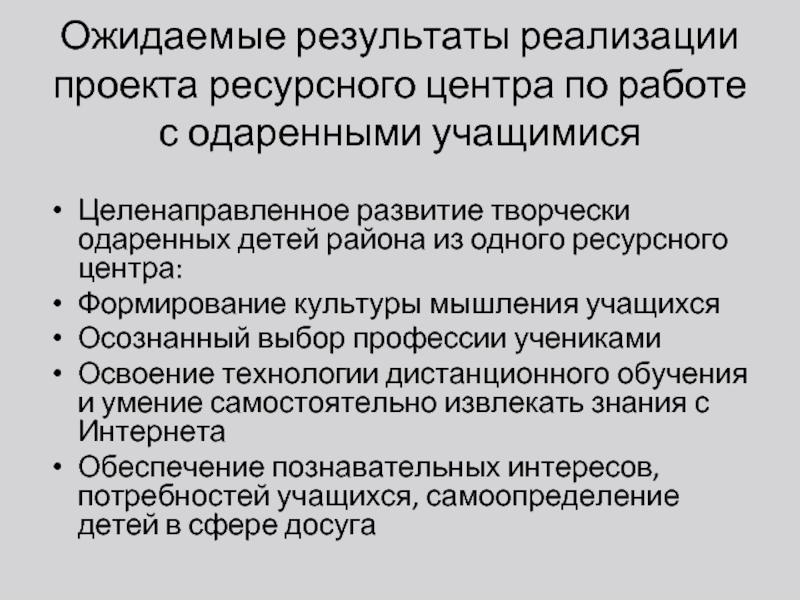 Слайд 22Ожидаемые результаты реализации проекта ресурсного центра по работе с одаренными учащимися