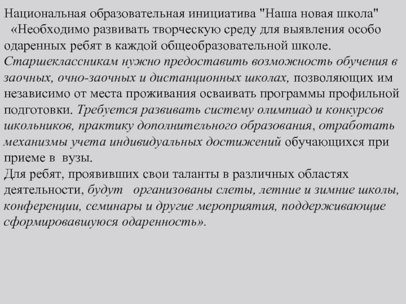 выявления особо одаренных ребят в каждой общеобразовательной школе. Старшеклассникам нужно предоставить возможность обучения в заочных, очно-заочных и дистанционных школах, позволяющих им независимо от места проживания осваивать программы профильной подготовки. Требуется развивать систему олимпиад и конкурсов школьников, практику дополнительного образования, отработать механизмы учета индивидуальных достижений обучающихся при приеме в вузы.