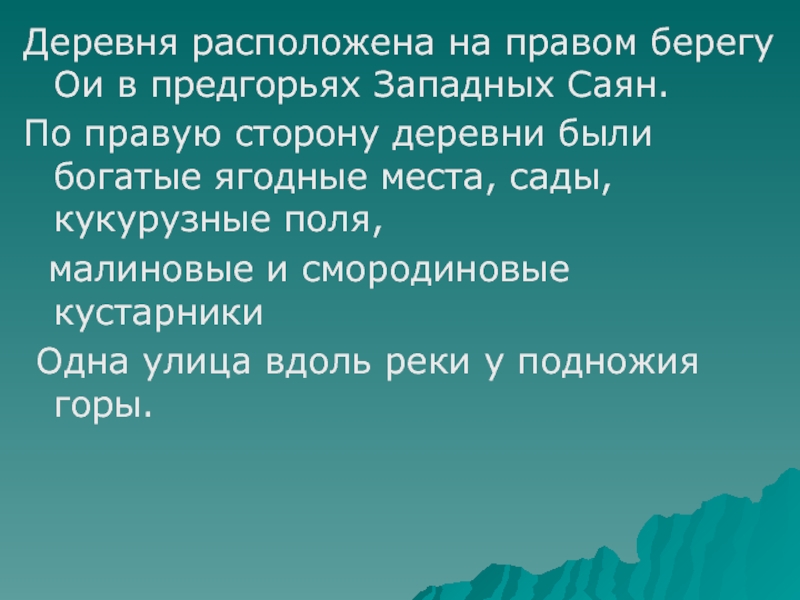 Слайд 5Деревня расположена на правом берегу Ои в предгорьях Западных Саян.