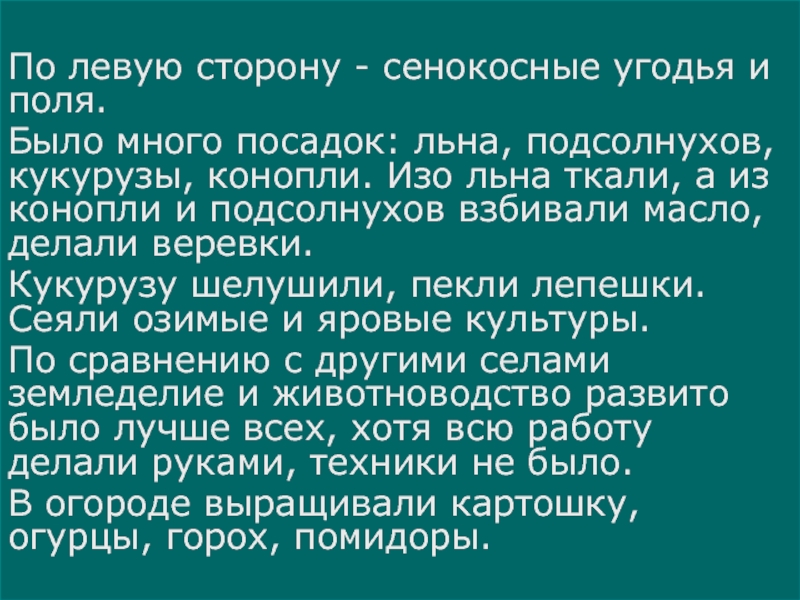 По сравнению с другими селами земледелие и животноводство развито было лучше всех, хотя всю работу делали руками, техники не было.