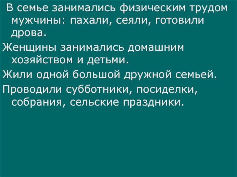 Слайд 12 В семье занимались физическим трудом мужчины: пахали, сеяли, готовили дрова.