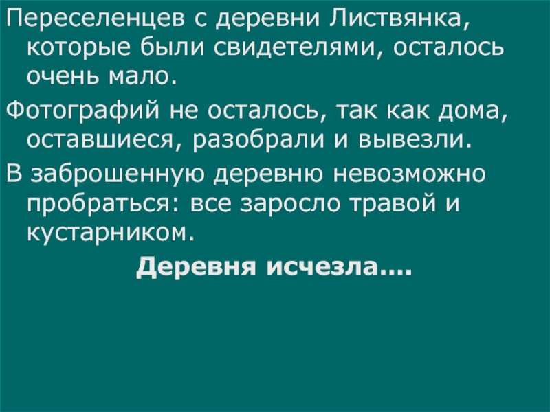 Слайд 14Переселенцев с деревни Листвянка, которые были свидетелями, осталось очень мало.