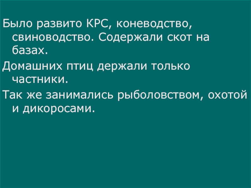 Было развито КРС, коневодство, свиноводство. Содержали скот на базах.