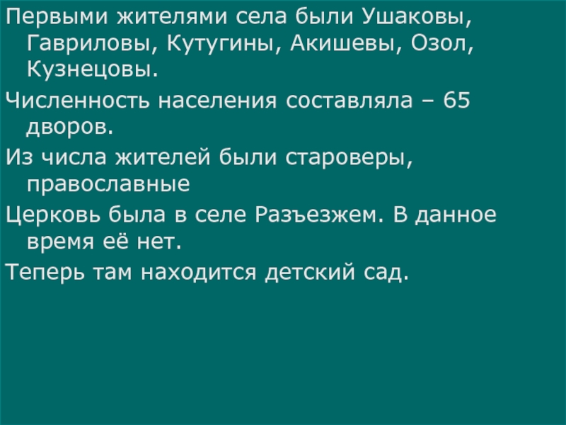 Слайд 11Первыми жителями села были Ушаковы, Гавриловы, Кутугины, Акишевы, Озол, Кузнецовы.