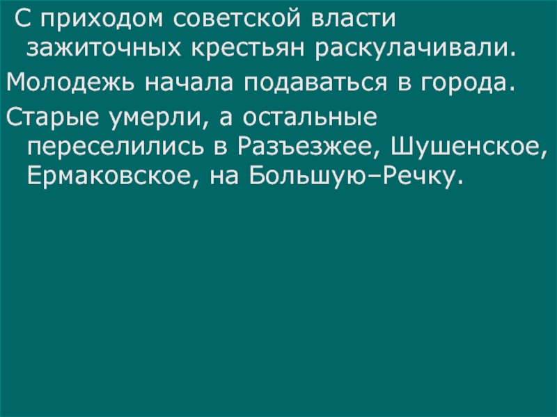 Старые умерли, а остальные переселились в Разъезжее, Шушенское, Ермаковское, на Большую–Речку.